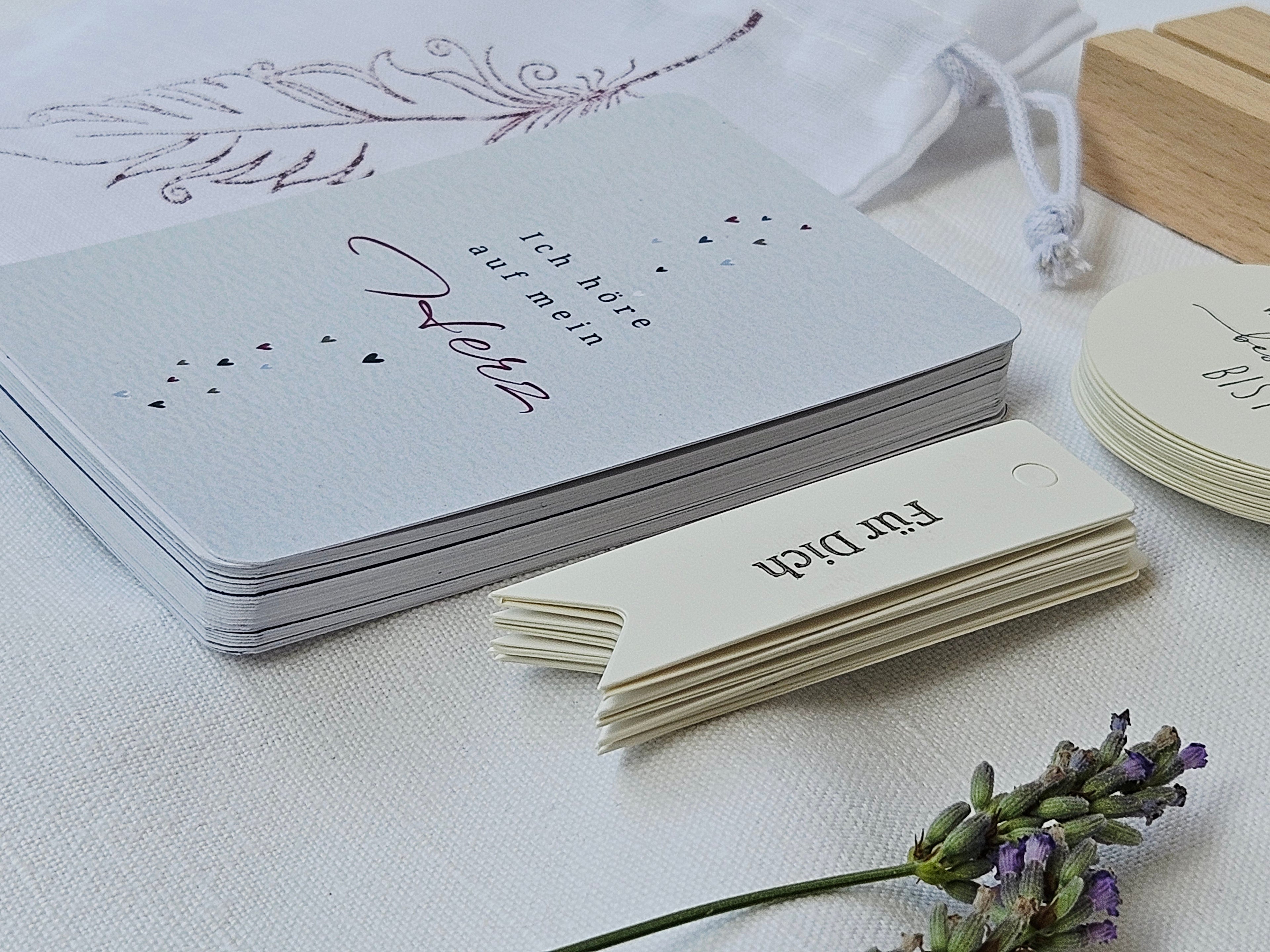 So arbeite ich mit hochWERTigen Materialien wie z.B. antikem Bauernleinen, Naturprodukten wie reines Lavendelwasser und Affirmationskarten aus receyceltem Papier. Materialien, oft mit Geschichte und Charakter, erhalten eine zweite Chance – und werden zu neuen Schätzen, die ein neues Zuhause bei meinen Kunden finden dürfen.