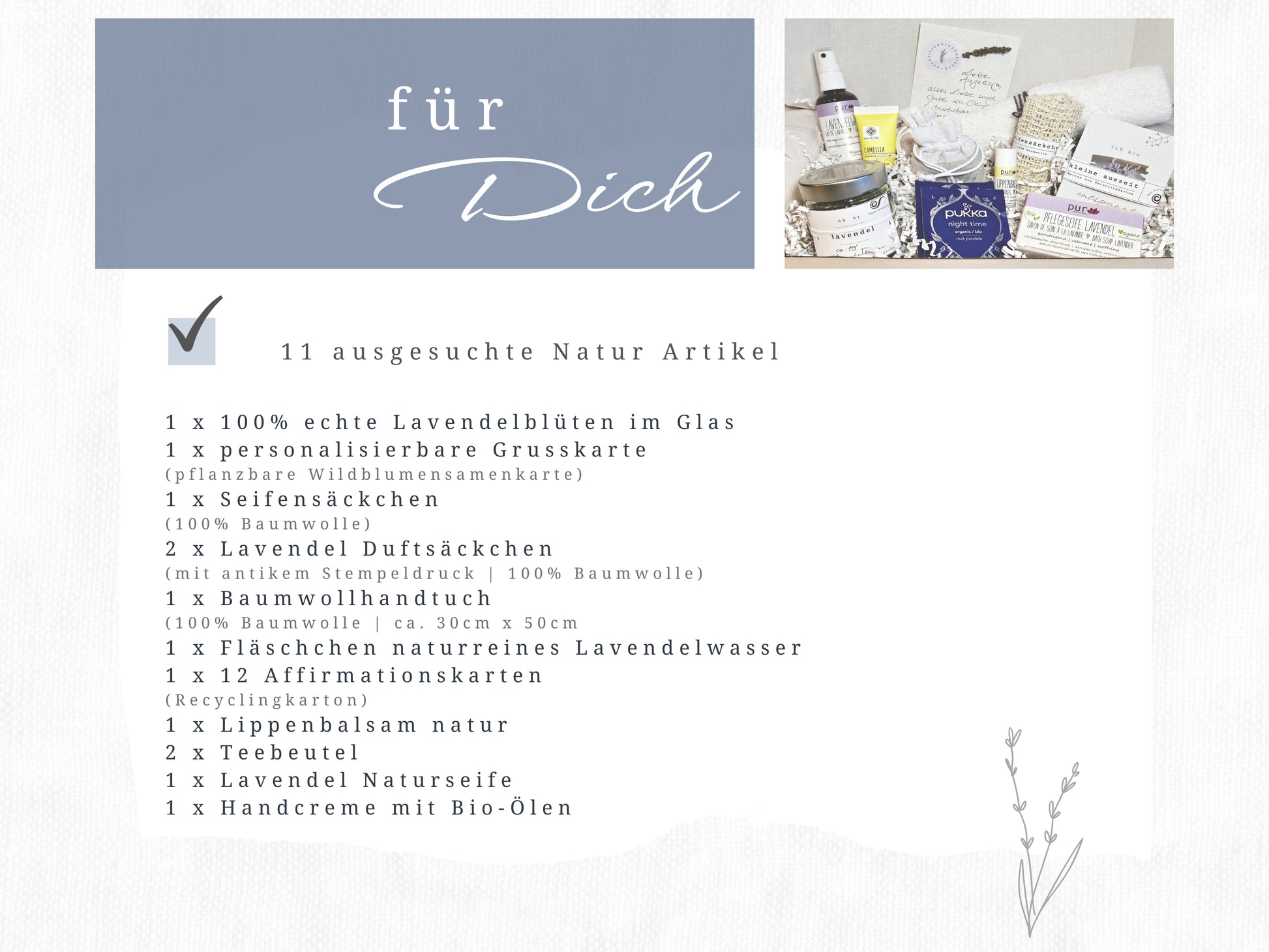 mit einem Wellness Geschenkset für Frauen. Geschenke mit Lavendel sind perfekt für eine kleine Auszeit vom Alltag - z.B. als Weihnachtsgeschenk oder Geburtstagsgeschenk für Frauen.