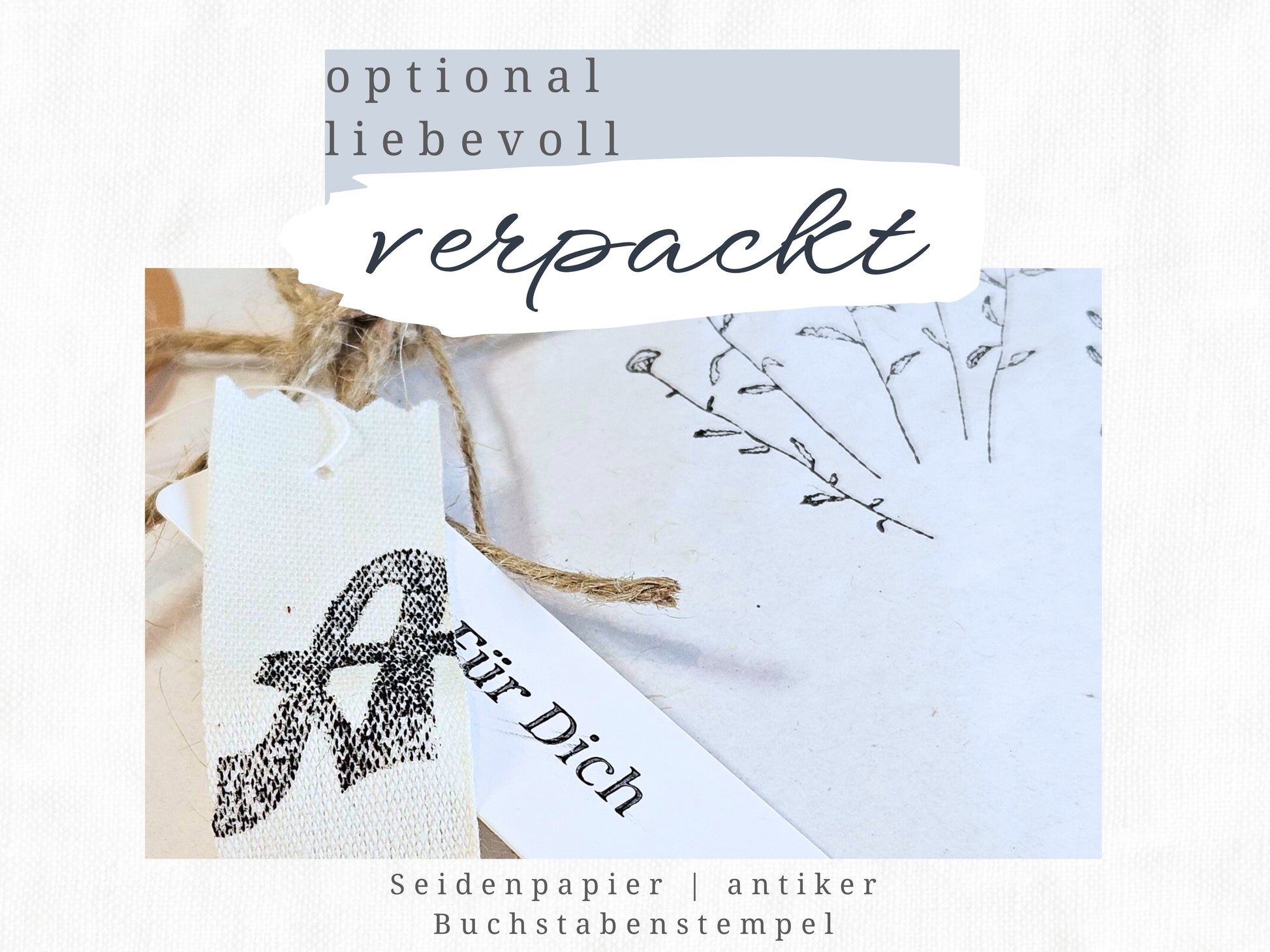 Möchtest du eine besonders liebevolle Verpackung? Gerne verpacke ich die Produkte gegen einen kleinen Aufpreis in weißes Seidenpapier, bestempelt mit einem zarten Blütenmuster, und umwickle sie mit feinem Papierband. Verziert wird die Verpackung mit einem kleinen Anhänger "Für Dich" und einem Baumwollstoff, auf den ich Deinen Wunschbuchstaben von Hand mit einem antiken Buchstaben aufstempel. Aufgrund des Alters der Stempel kann der Stempelabdruck u.U. nicht vollständig scharf erscheinen - dies unterstreicht den Vintage Charakter und stellt keinen Reklamationsgrund dar.
